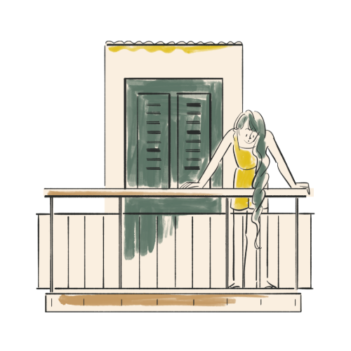 This vibrant balcony overlooks a peaceful hillside town with lush greenery and distant mountains. Sunlight casts artistic shadows on the marble floor. Cozy seating with colorful cushions, a wooden table, and serene Buddha artwork create a warm, inviting atmosphere for relaxation.